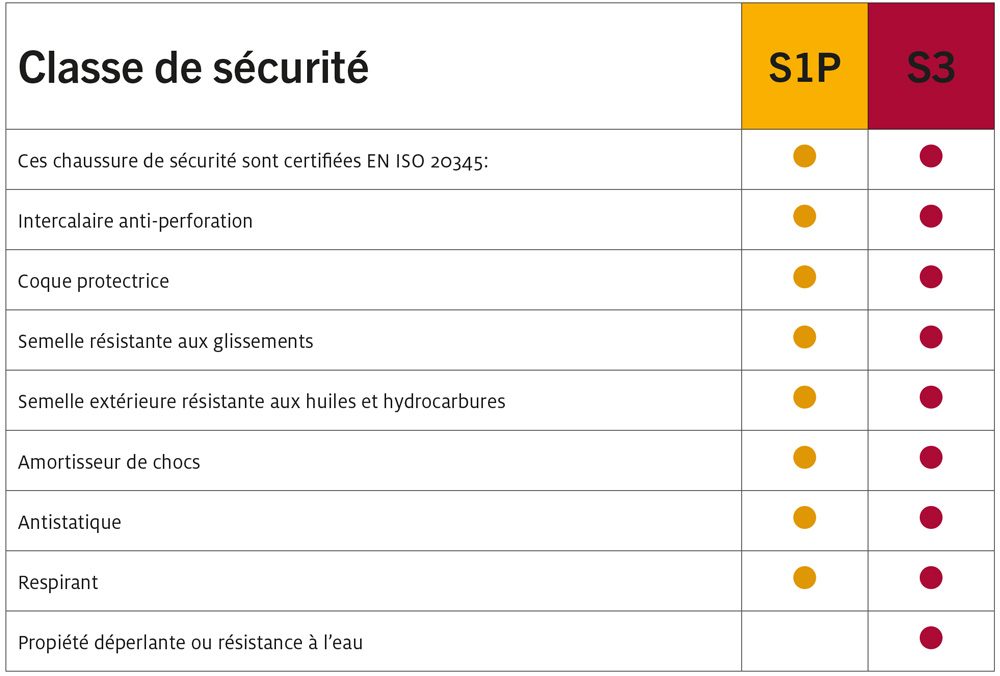 Tous ces modèles sont certifiés selon la plus haute classe en termes de semelles antidérapantes et elles sont évidemment certifiées selon la norme EN ISO 20345. Vous pouvez choisir entre les classes de sécurité S1P et S3, les chaussures de classe S3 étant dotées d’un revêtement extérieur imperméable conformément à la norme.